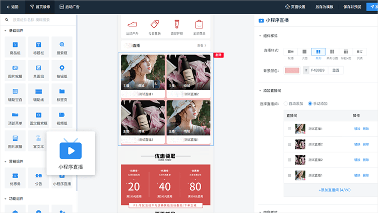 店铺装修新增直播组件,支持商品多页面添加直播入口