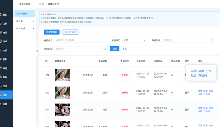 商家端适配直播间管理功能,运营、分享、开播可操作