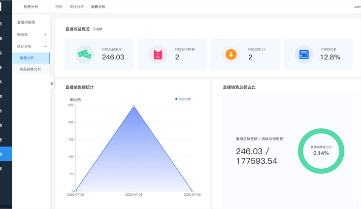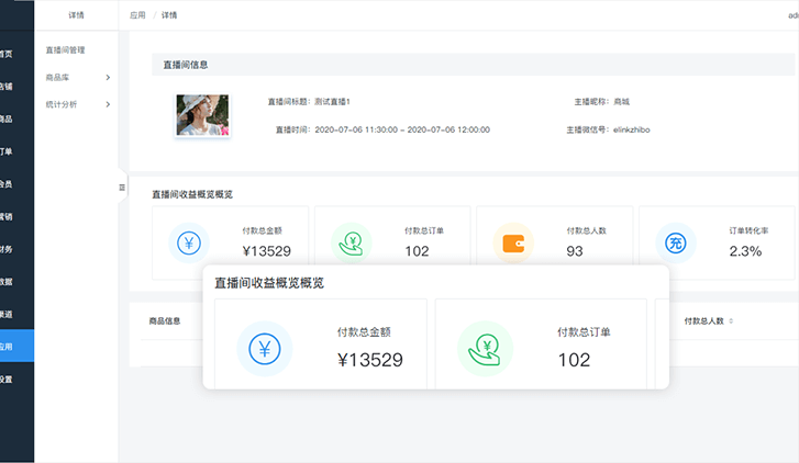 可查看单个直播间信息及付款金额、订单、人数、转化率等