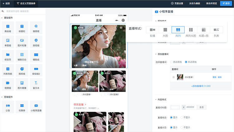 支持5种直播样式,可自定义直播列表页面添加直播间